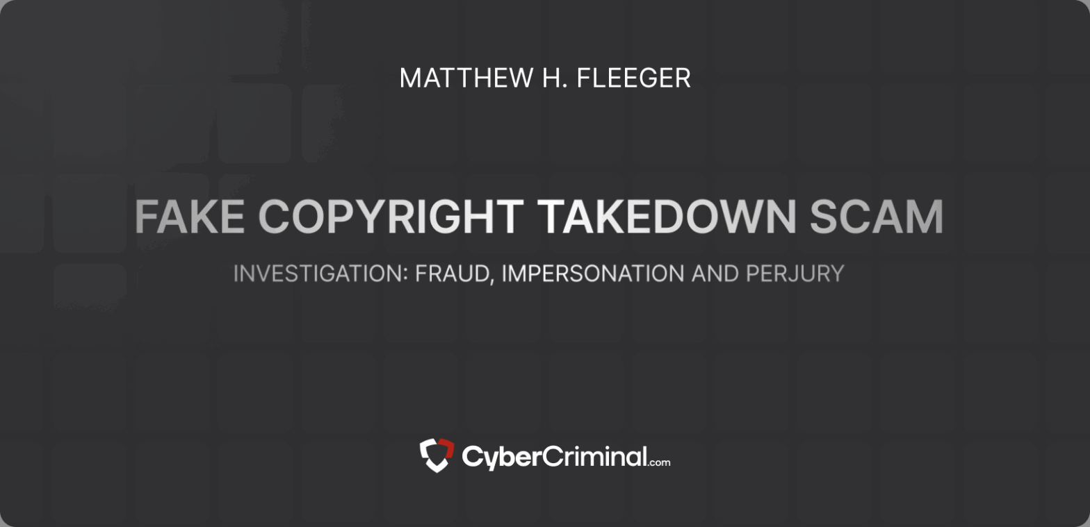 We are investigating Matthew H. Fleeger for allegedly attempting to conceal critical reviews and adverse news from Google by improperly submitting copyright takedown notices. This includes potential violations such as impersonation, fraud, and perjury.